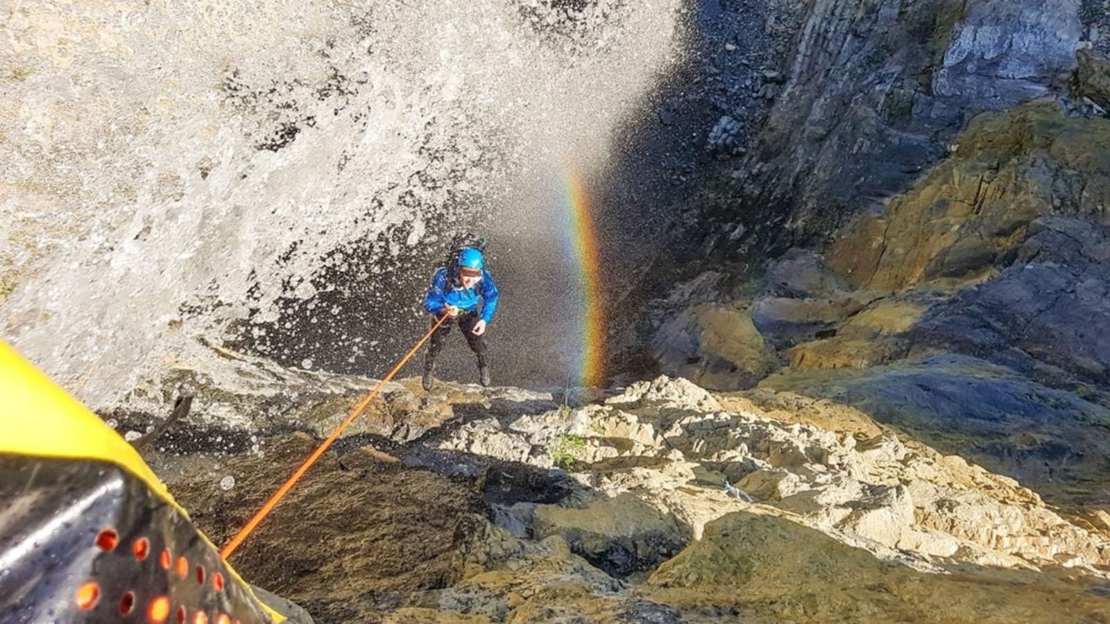 Some exposure to heights is unavoidable since both trips involve rappelling and jumps. The ground trip is rated "Occasionally sporty" and is more manageable for first-timers, while the heli-trip at "Sporty" assumes you're already comfortable with vertical exposure.