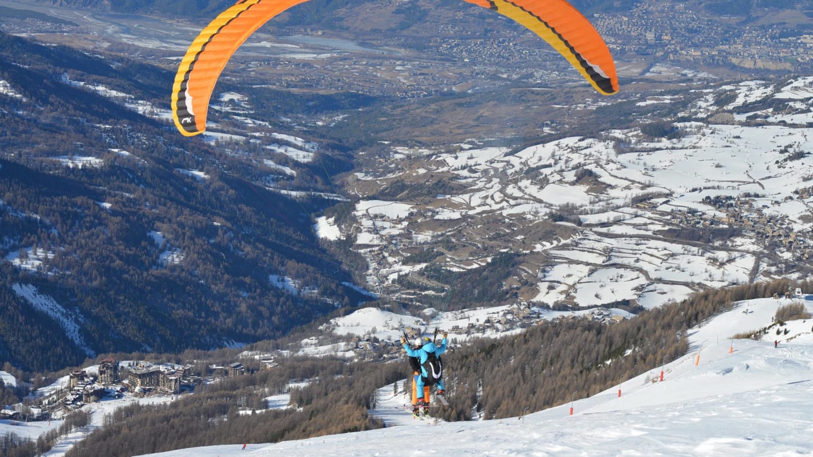 Winter tandem paragliding in Les Orres, Alps