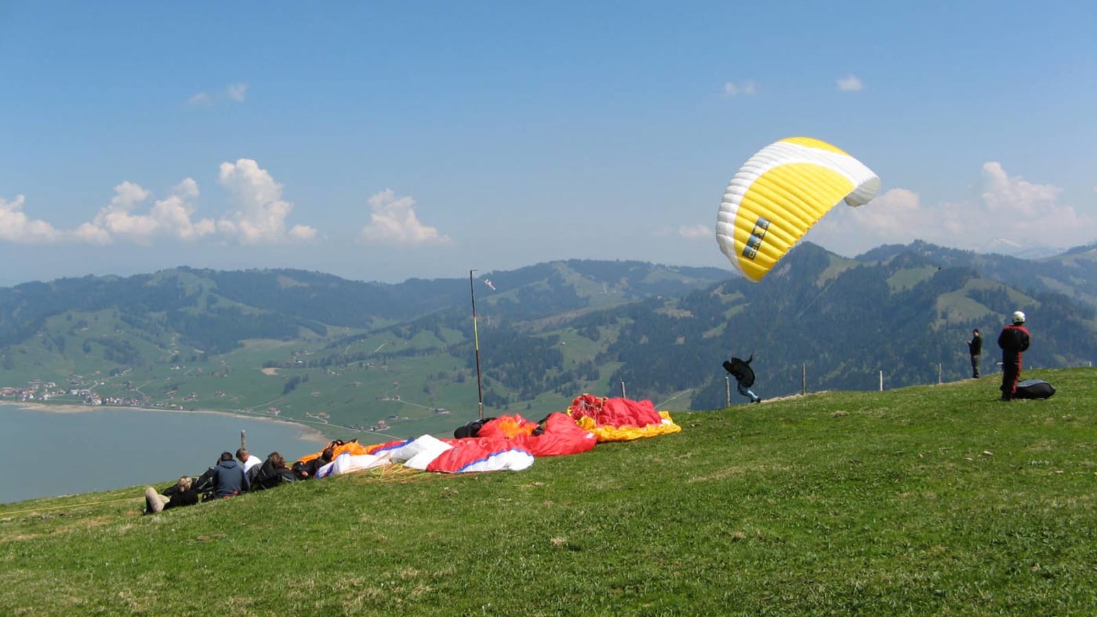 The launch off the hillside above Horgen is where adrenaline peaks. You go from standing still to airborne in a few running steps, with the ground dropping away instantly beneath you.