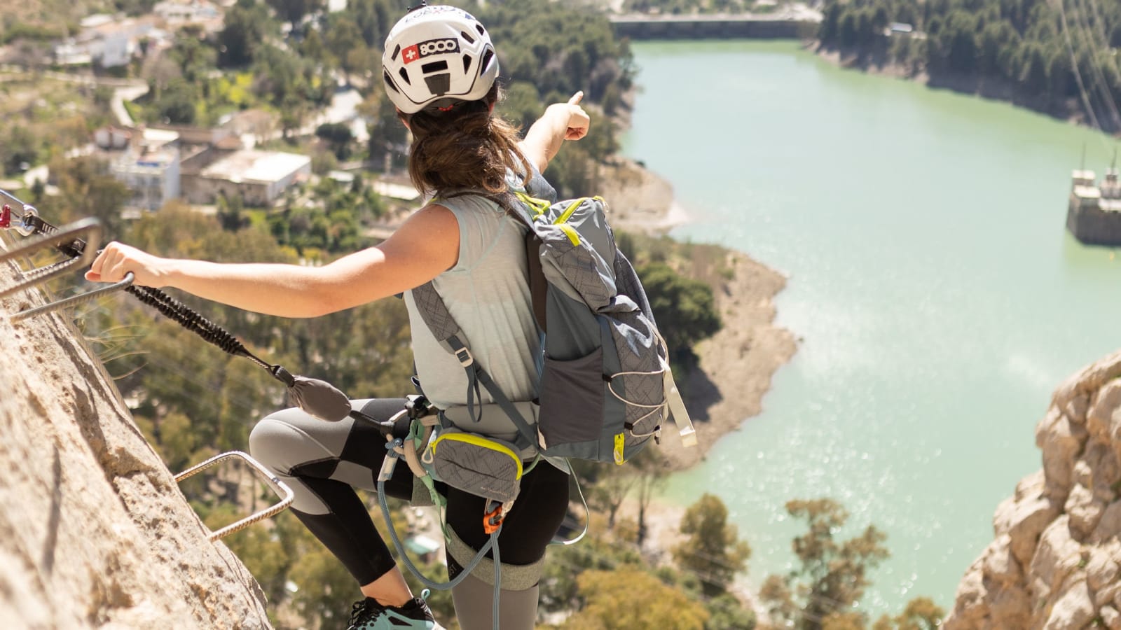 Harness, helmet and via ferrata set (Y-lanyard) are provided by La Garganta Activa. Wear closed-toe shoes with ankle support, bring 1.5 L of water minimum for a 3h to 4h outing in the Málaga sun, and pack a light layer for shaded gorge sections.